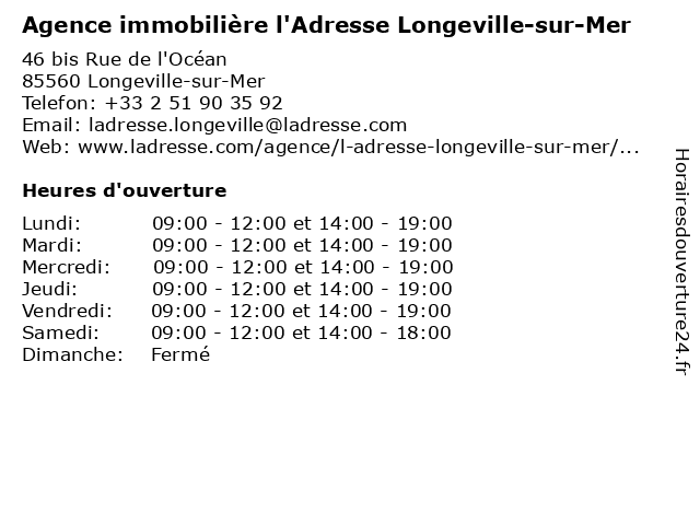 1 Orpi - Agence Immobilière Jardaise (Distance: 6,38 km) 2 place de l'Hotel de Ville, 85520 Jard sur mer agence, immobilière, jardaise, orpi 2 Agence immobilière l'Adresse Moutiers-les-Mauxfaits (Distance: 9,34 km) 1 Place du Gén de Gaulle, 85540 Moutiers-les-Mauxfaits agence, immobilière, l'adresse, les, mauxfaits, moutiers 3 Agence immobilière l'Adresse La Tranche-sur-Mer (Distance: 9,79 km) 46 Avenue de la Plage, 85360 La Tranche-sur-Mer agence, immobilière, l'adresse, la, mer, sur, tranche 4 Agence immobilière l'Adresse Talmont-Saint-Hilaire (Distance: 11,50 km) 70 Avenue des Sables, 85440 Talmont-Saint-Hilaire agence, hilaire, immobilière, l'adresse, saint, talmont 5 BARNES - Agence Immobilière (Distance: 19,06 km) 11 Place de La Liberté, 17880 Les Portes-en-Ré achats, agence, barnes, immobilière, luxe, ventes 6 L'Adresse Immobilier (Distance: 24,31 km) 28 avenue de la Plage, 85150 La Mothe-Achard agence, gestion, immobilier, l'adresse, location, transaction, vente |