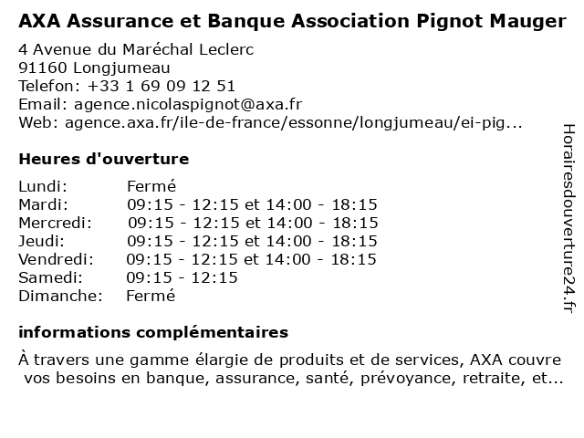 1 AXA Assurance et Banque Association Pignot Mauger (Distance: 9,91 km) 19 Rue Albert Rémy, 91130 Ris-Orangis association, assurance, assurance appartement, assurance auto, assurance entreprise, assurance epargne, assurance habitation, assurance maison, assurance professionnelle, assurance santé, assurance voiture, axa, banque, et, mauger, pignot 2 Banque Populaire (Distance: 0,11 km) 12 rue de Chilly, 91160 Longjumeau agence, assurance, bancaire, banque, populaire 3 Axa Assurance (Distance: 1,06 km) 87 Rue Raspail, 91140 Villebon Sur Yvette assurance, assurance prêt, assurances, axa, services 4 Volkswagen (Assurance Véhicule) (Distance: 2,34 km) . Route De Villebon, 91160 Champlan assurance, automobiles, concessionnaire, garage, motos, volkswagen, véhicule 5 AXA Prévoyance & Patrimoine Maxo Marseille (Distance: 3,46 km) 6 Rue du Docteur Albert Schweitzer, 91420 Morangis assurance décès, assurance entreprise, assurance epargne, assurance invalidité, assurance patrimoine, assurance profession libérale, assurance protection juridique, assurance prévoyance, assurance santé, assurance vie, axa, marseille, maxo, patrimoine, prévoyance 6 AXA Assurance et Banque Colombel Laruelle, Marchal (Distance: 7,84 km) 29 Rue de Paris, 91400 Orsay assurance, assurance appartement, assurance auto, assurance entreprise, assurance epargne, assurance habitation, assurance maison, assurance professionnelle, assurance santé, assurance voiture, axa, banque, colombel, et, laruelle, marchal |