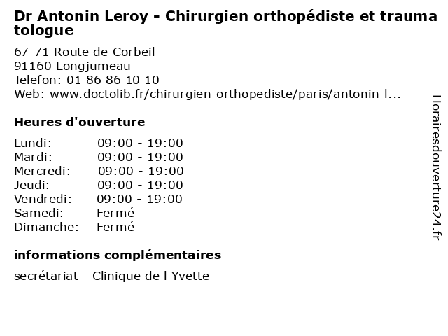 1 Dr Antonin Leroy - Chirurgien orthopédiste et traumatologue (Distance: 17,58 km) 37 Rue Molitor, 75016 Paris antonin, chirurgien, consultation, docteur, dr, et, leroy, med, médecin, orthopédiste, traitement, traumatologue 2 Dr Quentin Tribot Laspiére - Chirurgien orthopédiste et traumatologue - secrétariat (Distance: 0,00 km) 67-71 Route de Corbeil, 91160 Longjumeau chirurgien, consultation, docteur, dr, et, laspiére, med, médecin, médecine, orthopédiste, quentin, secrétariat, traitement, traumatologue, tribot 3 Dr Matthieu Begin - Chirurgien orthopédiste et traumatologue (Distance: 0,00 km) 67-71 Route de Corbeil, 91160 Longjumeau begin, chirurgien, consultation, docteur, dr, et, matthieu, med, médecin, médecine, orthopédiste, secrétariat, traitement, traumatologue 4 Dr Sophie Monin - Chirurgien orthopédiste et traumatologue (Distance: 0,00 km) 67-71 Route de Corbeil, 91160 Longjumeau chirurgien, consultation, docteur, dr, et, med, monin, médecin, médecine, orthopédiste, secrétariat, sophie, traitement, traumatologue 5 Dr Thierry Kapandji - Chirurgien orthopédiste et traumatologue (Distance: 0,00 km) 67-71 Route de Corbeil, 91160 Longjumeau chirurgien, consultation, docteur, dr, et, kapandji, med, médecin, médecine, orthopédiste, secrétariat, thierry, traitement, traumatologue 6 Dr Thomas Waitzenegger - Chirurgien orthopédiste et traumatologue (Distance: 0,00 km) 67-71 Route de Corbeil, 91160 Longjumeau chirurgien, consultation, docteur, dr, et, med, médecin, médecine, orthopédiste, secrétariat, thomas, traitement, traumatologue, waitzenegger |