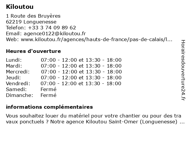 1 Kiloutou Saint-Omer (Longuenesse) (Distance: 0,17 km) 1 Route des Bruyères, 62219 Longuenesse abri de chantier, aspirateur de chantier, base vie de chantier, brise-béton, broyeur de branches et de végétaux, brumisateur de chantier, bungalow de chantier, bétonnière, carotteuse, compresseur d'air, débroussailleuse, décolleuse de papier-peint, découpeuse, déshumidificateur d'air, foreuse, kiloutou, location matériel, longuenesse, marteau-piqueur, matériel btp, matériel chantier, matériel tp, matériel travaux publics, module de chantier, nettoyeur à haute pression, omer, outillage, outils, perforateur-burineur, pilonneuse, pistolet à peinture, plaque vibrante, ponceuse à parquet, remorque, sableuse, saint, shampouineuse, taille-haie, tondeuse à gazon, tronçonneuse à matériaux, échafaudage 6 Kiloutou (Distance: 43,02 km) 43 Route Nationale, 62950 Noyelles auchan, centre, commercial, kiloutou, noyelles |