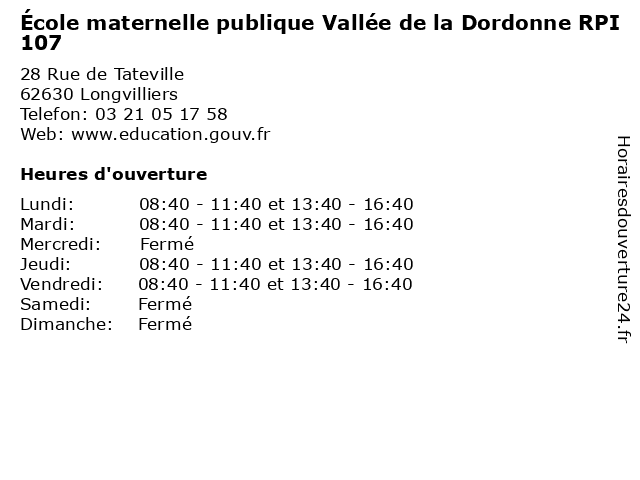 1 Ecole Primaire Publique de la Vallée de la Dordonne - RPI 107 (Distance: 2,38 km) . Place du 14 Juillet, 62630 Cormont 107, cours, de, dordonne, ecole, education, la, primaire, publique, rpi, services, vallée, école 2 École Élémentaire publique la Vallée de la course RPI 83 (Distance: 3,66 km) . Village, 62170 Montcavrel 83, cours, course, de, la, publique, rpi, services, vallée, école, élémentaire 3 École primaire publique la Vallée de la course RPI 83 (Distance: 3,93 km) 302 Rue de la Vallée, 62170 Inxent 83, course, de, ecole, education, la, maternelle, primaire, publique, rpi, services, vallée, école 4 École primaire publique mixte Vallée de la Dordonne RPI 107 (Distance: 4,73 km) 4 Rue Longue, 62630 Hubersent 107, cours, de, dordonne, education, la, mixte, primaire, publique, rpi, services, vallée, école 5 École Maternelle Publique RPI 109 (Distance: 7,06 km) 1 Rue de l'Ecole, 62170 La Calotterie 109, cours, education, maternelle, publique, rpi, services, école 6 École Primaire Publique RPI 102 (Distance: 7,44 km) . Place de la Mairie, 62830 Halinghen 102, cours, education, primaire, publique, rpi, services, école |