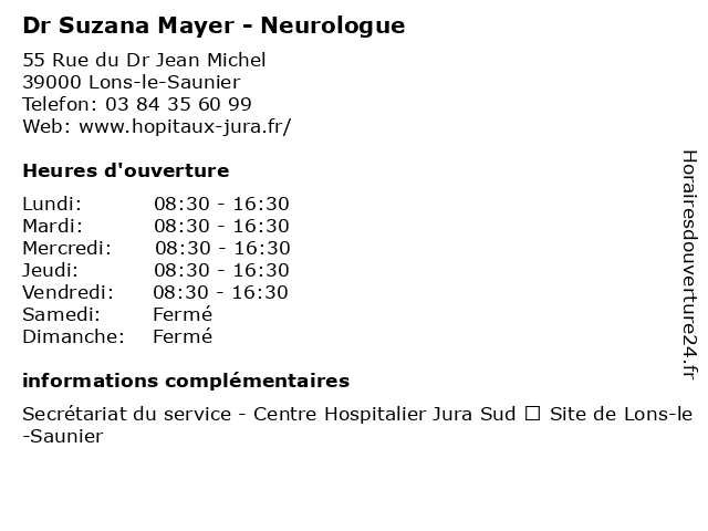 Termes de recherche pour Dr Suzana Mayer - Neurologue:le, de, lons, centre, sud, mayer, site, saunier, jura, hospitalier, neurologie, dr, neurologue, cerveau, suzana, nerf |