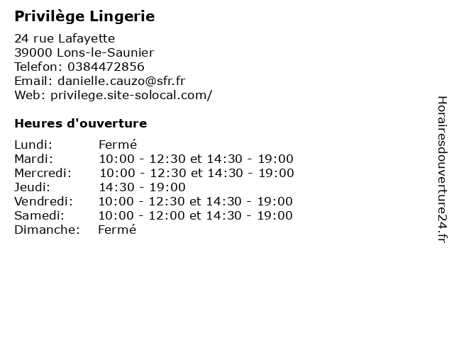 1 Etam Lingerie (Distance: 0,05 km) 8 rue Lecourbe, 39000 Lons-le-Saunier body, etam, femme, habillement, lingerie, nuisette, nuit 2 Doussot C. Lingerie (Distance: 0,21 km) 31 Rue Saint-Désiré, 39000 Lons-le-Saunier accesoires, c., doussot, habillement, lingerie, vêtement 3 Pascal RAULT, Christophe BAS et Elise CLERC-BARNABE Notaires Associés SCP (Distance: 0,52 km) 21 Rue Rouget de Lisle, 39000 Lons-le-Saunier associés, barnabe, bas, christophe, clerc, elise, et, notaires, pascal, rault, scp 4 Décolletage du Bas Jura - DBJ (Distance: 31,88 km) 450 rue du Marais, 39320 Val Suran bas, dbj, du, décolletage, jura, pièces, pièces haute précision, usinage 5 La Lingerie D'Ange (Distance: 47,08 km) 5 Rue Voltaire, 01100 Oyonnax bas, boxer, corset, culotte, d'ange, la, lingerie, nuisette, tanga 6 Netto (Distance: 47,79 km) - Cézilles, 01340 Jayat achats de produits alimentaires, des prix bas, grands supermarchés, hard discount, netto, supermarchés |
