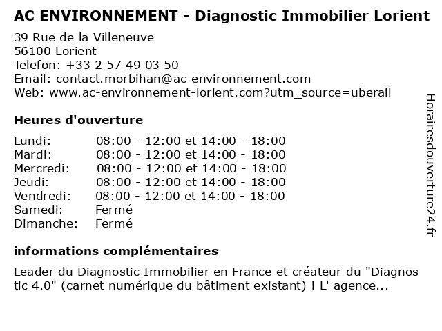 2 Diagamter - Diagnostic Immobilier (Distance: 0,97 km) 37 Rue de Merville, 56100 Lorient agence, centre, conseils, diagamter, diagnostic, diagnostiqueur, immobilier, études 3 Allo Diagnostic (Distance: 1,04 km) 13 Cours de Chazelles, 56100 Lorient allo, diagnostic, immobilier, services 5 Direction régionale de l'environnement, de l'aménagement et du logement (DREAL) (Distance: 1,50 km) 34 rue Jules-Legrand, 56100 Lorient amenagement, commune, de, direction, dreal, du, environnement, et, information, l'aménagement, l'environnement, logement, public, régionale, service 6 |