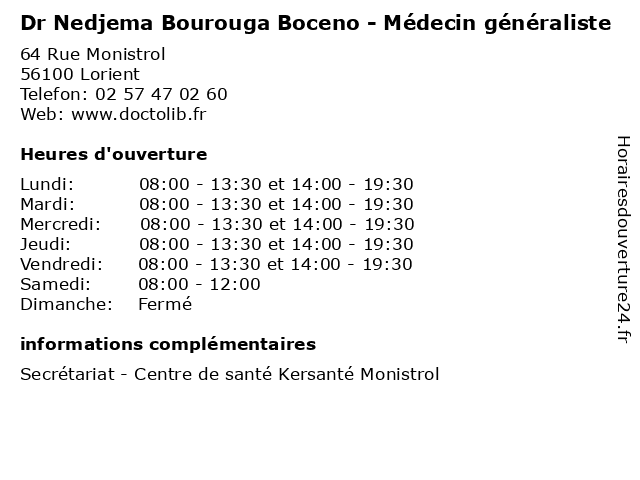| Lundi | 08:00-13:30 et 14:00-19:30 |