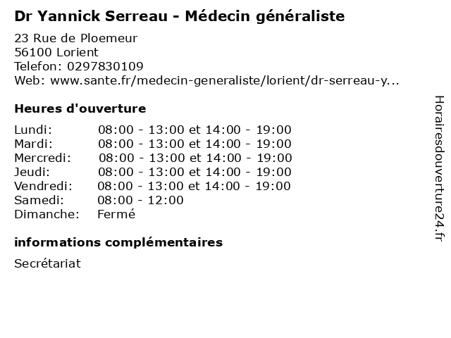 | Lundi | 08:00-13:00 et 14:00-19:00 |