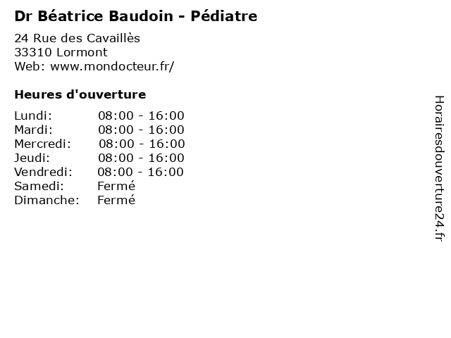 1 Dr Béatrice Baudoin - Pédiatre (Distance: 7,65 km) 32 Rue Edison, 33400 Talence baudoin, béatrice, care, clinic, dentist, dermatologue, dr, france, gynécologue, health, kinesitherapeute, ophtalmologiste, orl, psychologue, pédiatre, service 2 Dr Jean-François Pujol - Pédiatre (Distance: 0,02 km) 24 Rue des Cavailles, 33310 Les Lormont consultation, docteur, domicile, dr, en, francois, françois, generale, jean, medecine, pujol, pédiatre, santé, visite 3 Dr Patrice Baudoin- Angiologue (Distance: 0,05 km) 24 Rue des Cavaillès, 33310 Lormont angiologue, baudoin, consultation, docteur, dr, med, médecin, médecine, patrice, traitement 4 Baudoin Boutami Gauthier Pelras Pulci Lopez-Godbert SELARL ANGIA (Distance: 0,05 km) 24 Rue des Cavailles, 33310 Lormont angia, baudoin, boutami, gauthier, godbert, lopez, pelras, pulci, selarl 5 Dr Valerie Siao Him Fa - Pédiatre (Distance: 0,10 km) 17 Rue des Cavailles, 33310 Lormont dr, enfant, fa, him, pediatre, pédiatre, sante, siao, soins, valerie 6 Dr Patrice Baudoin - Radiologue (Distance: 4,45 km) 15 à 35 rue Claude Boucher, 33300 Bordeaux aquitaine, baudoin, bordeaux, diagnostique, dr, imagerie, nord, patrice, polyclinique, radiologie, radiologue, thérapeutique |