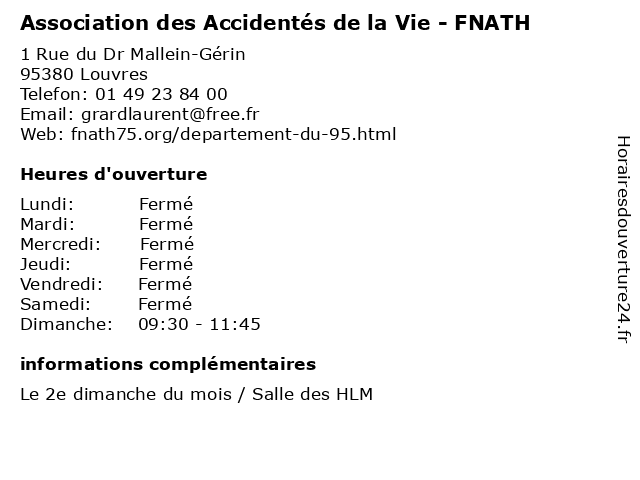 1 Association des Accidentés de la Vie - FNATH (Distance: 2,45 km) Place de la Charmeuse, 95190 Goussainville accidents, accidentés, association, chemin, de, des, fnath, groupement, la, vert, vie 2 Association des Accidentés de la Vie - FNATH (Distance: 8,49 km) 17 Place Marc Sangnier, 95500 Gonesse accidents, accidentés, association, chemin, de, des, fnath, groupement, la, vert, vie 3 École élémentaire publique Germaine Vie (Distance: 3,33 km) 14 Rue Pierre Sémard, 95190 Goussainville cours, education, germaine, publique, services, vie, École, école, élémentaire 4 CLCV - Consommation, Logement et Cadre de Vie (Distance: 3,34 km) 31 Boulevard Henri Dunant, 95190 Goussainville association, cadre, clcv, consommateur, consommation, de, environnement, et, logement, vie 5 Association Force Ouvrière Consommateurs (AFOC) (Distance: 5,36 km) 383 Rue de la Belle Étoile, 93290 Tremblay-en-France afoc, aide, association, consommateurs, force, ouvrieres, ouvrière 6 Association Yoga De Fosses (Distance: 6,59 km) 22 Square du Maine, 95470 Fosses association, de, fosses, yoga |