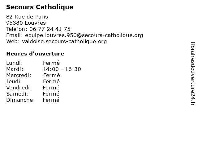 1 Secours Catholique (Distance: 3,72 km) 22 Rue Pierre Sémard, 95190 Goussainville accueil, association, catholique, organisation, secours 2 Secours Catholique (Distance: 9,43 km) 1 Rue Boichue, 95400 Arnouville et Gonesse accueil, association, catholique, organisation, secours 3 Secours Catholique (Distance: 10,00 km) 3 bis Boulevard Carnot, 95400 Villiers le Bel accueil, association, catholique, organisation, secours 4 Secours Catholique (Distance: 10,53 km) 9 Allée de Londres, 93600 Aulnay-Sous-Bois accueil, association, catholique, organisation, secours 5 Secours Catholique (Distance: 10,82 km) 10 bis Grande Rue, 95460 Ezanville accueil, association, catholique, organisation, secours 6 Secours Catholique (Distance: 11,19 km) 5 Boulevard de l’Hôtel de Ville, 93290 Tremblay-en-France accueil, association, catholique, organisation, secours |
