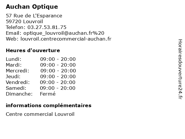 1 Auchan Optique (Distance: 0,76 km) . Louvroil, 59720 Louvroil auchan, beaute, boutiques, brasserie, cache, chaussures, concorde, deco, enfants, mode femme, mode hommes, optique, restaurant, sport 2 Auchan Optique (Distance: 2,72 km) . D121, 59720 Louvroil auchan, beaute, cafe, femme, homme, maison, mode, optique, sport 3 Auchan (Distance: 0,00 km) 57 Rue de L'Esparance, 59720 Louvroil auchan, cafe, chaussures, enfants, homme, lingerie, mode femme, restaurant, service 4 Auchan Drive (Distance: 0,00 km) 57 Rue de L'Esparance, 59720 Louvroil auchan, cafe, chaussures, drive, enfants, homme, lingerie, mode femme, restaurant, service 5 Auchan Services/SAV (Distance: 0,00 km) 57 Rue de L'Esparance, 59720 Louvroil auchan, cafe, chaussures, enfants, homme, lingerie, mode femme, restaurant, service, services/sav 6 Station Service Auchan (Distance: 0,00 km) 57 Rue de L'Esparance, 59720 Louvroil auchan, cafe, chaussures, enfants, homme, lingerie, mode femme, restaurant, service, station |