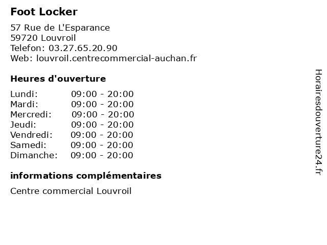1 Foot Locker (Distance: 0,20 km) Rue de l'espérance centre commercial auchan louvroil cellule n° 355, 59720 Louvroil foot, locker, magasin d?accessoires de mode, magasin de vêtements de sport, mode 2 Foot Locker (Distance: 0,76 km) . Louvroil, 59720 Louvroil beaute, boutiques, brasserie, cache, chaussures, concorde, deco, enfants, foot, locker, mode femme, mode hommes, restaurant, sport 3 Foot Locker (Distance: 2,72 km) . D121, 59720 Louvroil beaute, cafe, femme, foot, homme, locker, maison, mode, sport 4 Foot Locker (Distance: 2,72 km) . D121, 59720 Louvroil beaute, cafe, femme, foot, homme, locker, maison, mode, sport 5 Foot Korner (Distance: 31,50 km) 1 Rue Derrière la Tour, 59300 Valenciennes chaussure, foot, korner, magasins, marques, services, sport 6 Foot Locker (Distance: 31,51 km) 14 Place d'Armes, 59003 Valenciennes baskets, chaussures, foot, locker, vêtements |