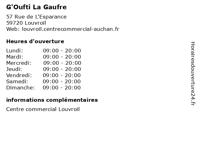 1 G'Oufti La Gaufre (Distance: 0,76 km) . Louvroil, 59720 Louvroil beaute, boutiques, brasserie, cache, chaussures, concorde, deco, enfants, g'oufti, gaufre, la, mode femme, mode hommes, restaurant, sport 2 G'Ofti La Gaufre (Distance: 2,72 km) . D121, 59720 Louvroil beaute, cafe, femme, g'ofti, gaufre, homme, la, maison, mode, sport 3 Auchan (Distance: 0,00 km) 57 Rue de L'Esparance, 59720 Louvroil auchan, cafe, chaussures, enfants, homme, lingerie, mode femme, restaurant, service 4 Auchan Drive (Distance: 0,00 km) 57 Rue de L'Esparance, 59720 Louvroil auchan, cafe, chaussures, drive, enfants, homme, lingerie, mode femme, restaurant, service 5 Auchan Optique (Distance: 0,00 km) 57 Rue de L'Esparance, 59720 Louvroil auchan, cafe, chaussures, enfants, homme, lingerie, mode femme, optique, restaurant, service 6 Auchan Services/SAV (Distance: 0,00 km) 57 Rue de L'Esparance, 59720 Louvroil auchan, cafe, chaussures, enfants, homme, lingerie, mode femme, restaurant, service, services/sav |
