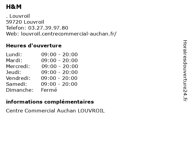 1 H&M (Distance: 0,76 km) 57 Rue de L'Esparance, 59720 Louvroil cafe, chaussures, enfants, h&m, homme, lingerie, mode femme, restaurant, service 3 Auchan Drive (Distance: 0,00 km) . Louvroil, 59720 Louvroil auchan, beaute, boutiques, brasserie, cache, chaussures, concorde, deco, drive, enfants, mode femme, mode hommes, restaurant, sport 4 Auchan Optique (Distance: 0,00 km) . Louvroil, 59720 Louvroil auchan, beaute, boutiques, brasserie, cache, chaussures, concorde, deco, enfants, mode femme, mode hommes, optique, restaurant, sport 5 Auchan Services (Distance: 0,00 km) . Louvroil, 59720 Louvroil auchan, beaute, boutiques, brasserie, cache, chaussures, concorde, deco, enfants, mode femme, mode hommes, restaurant, services, sport 6 Damart (Distance: 0,00 km) . Louvroil, 59720 Louvroil beaute, boutiques, brasserie, cache, chaussures, concorde, damart, deco, enfants, mode femme, mode hommes, restaurant, sport |