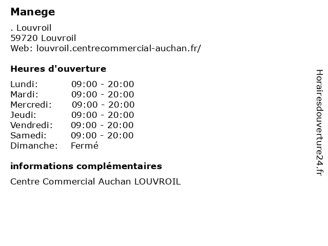 1 Manege (Distance: 0,76 km) 57 Rue de L'Esparance, 59720 Louvroil cafe, chaussures, enfants, homme, lingerie, manege, mode femme, restaurant, service 2 Manege (Distance: 2,02 km) . D121, 59720 Louvroil beaute, cafe, femme, homme, maison, manege, mode, sport 3 Auchan Drive (Distance: 0,00 km) . Louvroil, 59720 Louvroil auchan, beaute, boutiques, brasserie, cache, chaussures, concorde, deco, drive, enfants, mode femme, mode hommes, restaurant, sport 4 Auchan Optique (Distance: 0,00 km) . Louvroil, 59720 Louvroil auchan, beaute, boutiques, brasserie, cache, chaussures, concorde, deco, enfants, mode femme, mode hommes, optique, restaurant, sport 5 Auchan Services (Distance: 0,00 km) . Louvroil, 59720 Louvroil auchan, beaute, boutiques, brasserie, cache, chaussures, concorde, deco, enfants, mode femme, mode hommes, restaurant, services, sport 6 Damart (Distance: 0,00 km) . Louvroil, 59720 Louvroil beaute, boutiques, brasserie, cache, chaussures, concorde, damart, deco, enfants, mode femme, mode hommes, restaurant, sport |