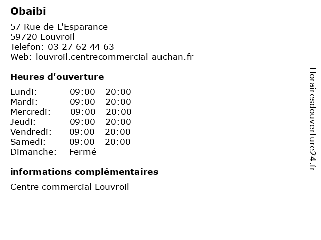 1 Obaibi (Distance: 2,72 km) . D121, 59720 Louvroil beaute, cafe, femme, homme, maison, mode, obaibi, sport 2 Auchan (Distance: 0,00 km) 57 Rue de L'Esparance, 59720 Louvroil auchan, cafe, chaussures, enfants, homme, lingerie, mode femme, restaurant, service 3 Auchan Drive (Distance: 0,00 km) 57 Rue de L'Esparance, 59720 Louvroil auchan, cafe, chaussures, drive, enfants, homme, lingerie, mode femme, restaurant, service 4 Auchan Optique (Distance: 0,00 km) 57 Rue de L'Esparance, 59720 Louvroil auchan, cafe, chaussures, enfants, homme, lingerie, mode femme, optique, restaurant, service 5 Auchan Services/SAV (Distance: 0,00 km) 57 Rue de L'Esparance, 59720 Louvroil auchan, cafe, chaussures, enfants, homme, lingerie, mode femme, restaurant, service, services/sav 6 Decathlon (Distance: 0,00 km) 57 Rue de L'Esparance, 59720 Louvroil cafe, chaussures, decathlon, enfants, homme, lingerie, mode femme, restaurant, service |