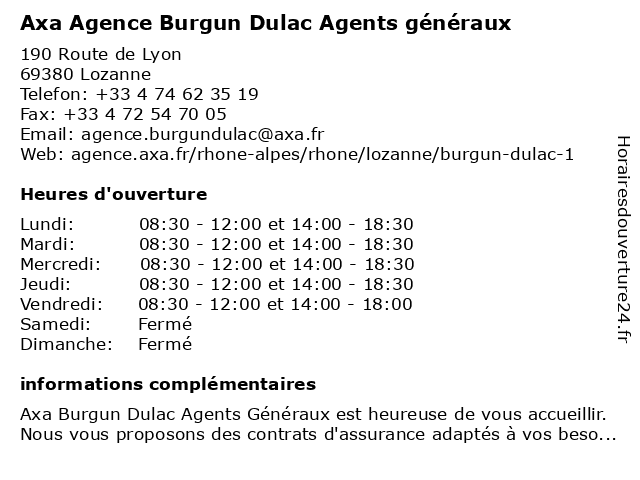 1 Axa Agence Burgun Dulac Agents généraux (Distance: 0,00 km) 190 Route de Lyon, 69380 Lozanne agence, agents, axa, burgun, dulac, généraux 2 Axa Agence Burgun Dulac Agents généraux (Distance: 0,00 km) 190 Route de Lyon, 69380 Lozanne agence, agents, axa, burgun, dulac, généraux 3 Axa Assurance (Distance: 11,68 km) 356 Chemin Des Coasses, 69620 Le Bois D'Oingt assurance, assurance prêt, assurances, axa, services 4 Axa Assurance (Distance: 12,15 km) 6 Montee De Preonde, 01601 Trevoux assurance, assurance prêt, assurances, axa, services 5 Axa Assurance (Distance: 12,42 km) 15 Rue De La Republique, 69583 Neuville Sur Saone assurance, assurance prêt, assurances, axa, services 6 Axa Assurance (Distance: 15,81 km) . Route Nationale 6, 69400 Limas assurance, assurance prêt, assurances, axa, services |