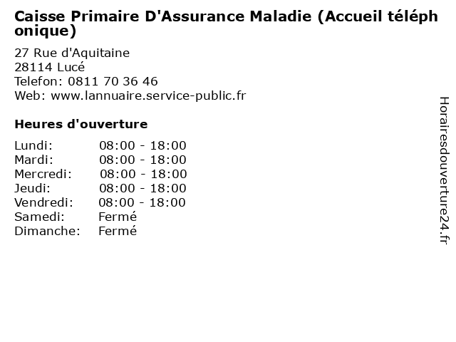 1 Caisse Primaire D'Assurance Maladie (Accueil téléphonique) (Distance: 2,64 km) 11 Rue du Docteur-André-Haye, 28034 Chartres accueil, administration, assoc, caisse, d'assurance, maladie, primaire, services, services publics, téléphonique 2 Caisse Primaire D'Assurance Maladie (Accueil téléphonique) (Distance: 19,53 km) 1 Rue du Pont-Rouge, 28130 Maintenon accueil, administration, assoc, caisse, d'assurance, maladie, primaire, services, services publics, téléphonique 3 Caisse Primaire d'Assurance Maladie (CPAM) (Distance: 0,22 km) 27 Rue d'Aquitaine, 28110 Lucé administration, assoc, caisse, cpam, d'assurance, maladie, primaire, services, services publics 4 Volkswagen (Assurance Véhicule) (Distance: 1,81 km) 8 Rue Jean Perrin, 28600 Luisant assurance, automobiles, concessionnaire, garage, motos, volkswagen, véhicule 5 Caisse Primaire D'Assurance Maladie (Distance: 2,64 km) 11 Rue du Docteur-André-Haye, 28034 Chartres administration, assoc, caisse, d'assurance, maladie, primaire, services, services publics 6 Caisse d'Epargne (Distance: 2,95 km) 13 Boulevard Chasles, 28000 Chartres banque, caisse, carte, d'epargne, services |
