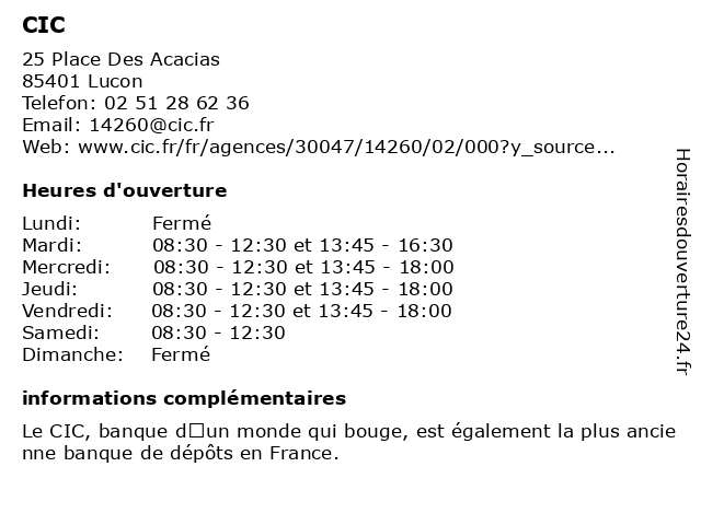 1 Crédit Industriel et Commercial (CIC) (Distance: 27,26 km) 3 Place De L'Hôtel De Ville, 85110 Chantonnay agence, assurance, bancaire, banque, cic, commercial, crédit, et, industriel 2 CIC (Distance: 27,56 km) 1 Rue Georges Clemenceau, 85200 Fontenay Le Comte cic, compagnie de téléphone, organisme d'assurance 3 CIC AGENCE (Distance: 30,19 km) 142 BOULEVARD DE L'INDUSTRIE, 85000 LA ROCHE SUR YON agence, casteljaloux, cic, l'argent, l'épargne, la trésorerie, les banques, les finances, les prêts 4 Crédit Industriel et Commercial (CIC) (Distance: 30,75 km) 142 Boulevard de l'Industrie, 85000 La Roche-sur-Yon agence, assurance, banque, cic, commercial, credit industriel et commercial, crédit, et, industriel 5 Crédit Industriel et Commercial (CIC) (Distance: 31,36 km) - Rue du 14 juillet, 17138 Puilboreau agence, argent, assurance, bancaire, banque, cic, commercial, conseil, credit, crédit, et, finance, industriel, patrimoine, pret 6 Crédit Industriel et Commercial (CIC) (Distance: 31,89 km) 9 Quai de la Poithevinière, 17410 Saint-Martin-de-Ré agence, argent, assurance, bancaire, banque, cic, commercial, conseil, credit, crédit, et, finance, industriel, patrimoine |