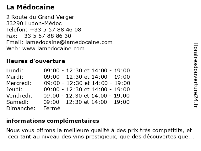 | Samedi | 09:00-12:30 et 14:00-19:00 |