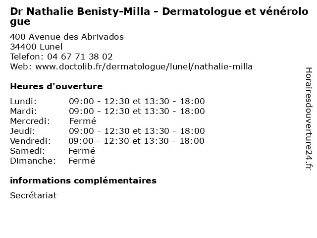 1 Dr Cécile Fabre - Dermatologue et vénérologue (Distance: 0,00 km) 400 Avenue des Abrivados, 34400 Lunel boutons, cécile, dermatologue, docteur, dr, et, fabre, liason, venerologue, vénérologue 2 Nathalie Moreno - Sage-femme (Distance: 0,08 km) 480 Avenue des Abrivados, 34400 Lunel femme, moreno, nathalie, sage, sagefemme, sante 3 Opticlin d’Oeil - Caroline Benisty Optique (Distance: 0,65 km) 4 Place de la République, 34400 Lunel accessoires, benisty, caroline, d’oeil, lunettes, magasin, opticien, opticlin, optique 4 Medecin Nathalie Berlander (diabétologue) (Distance: 0,75 km) 74 Place de la République, 34400 Lunel berlander, diabétologue, docteur, medecin, nathalie, sante, services 5 Nathalie Gonzalez - Sage-femme (Distance: 7,35 km) 17 rue Pierre Aubanel, 30470 Aimargues consultation, docteur, femme, gonzalez, med, médecin, médecine, nathalie, sage, traitement 6 Nathalie Cayuela - Orthophoniste (Distance: 11,93 km) 12 Avenue de la Condamine, 30600 Vauvert cayuela, medecin, nathalie, orthopho, orthophoniste, sante |