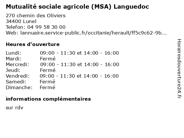 1 Mutualité sociale agricole (MSA) Languedoc (Distance: 10,67 km) - Place de l'Aficion, 30600 Vauvert accueil, agricole, information, languedoc, msa, mutualité, mutuelle, santé, sociale 2 Mutualité sociale agricole (MSA) Languedoc (Distance: 20,00 km) 581 rue Georges Méliès, 34000 Montpellier accueil, agricole, information, languedoc, msa, mutualité, mutuelle, santé, sociale 3 Languedoc Roussillon Matériaux L R M (Distance: 0,59 km) 71 Rue Clément Ader, 34400 Lunel languedoc, matériaux, roussillon 4 Crédit Agricole Mutuel Pyrénées Gascogne (Distance: 1,12 km) . Les Portes de la Mer, 34400 Lunel agricole, assurances, bancaire, banque, crédit, gascogne, mutuel, pyrénées, services 5 Crédit Agricole (Distance: 1,33 km) 181 Avenue Victor Hugo, 34400 Lunel agence, agricole, assurance, bancaire, banque, crédit 6 Crédit Agricole Mutuel Pyrénées Gascogne (Distance: 1,45 km) 1181 Avenue Victor Hugo, 34400 Lunel agricole, assurances, bancaire, banque, crédit, gascogne, mutuel, pyrénées, services |