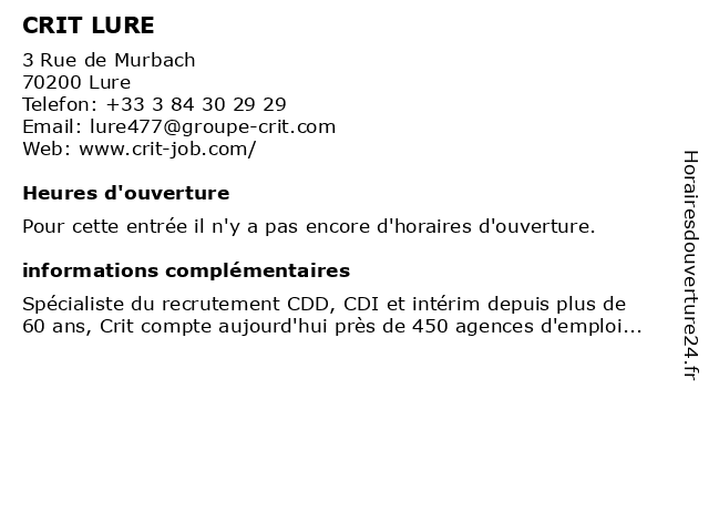 1 CRIT SAINT SAUVEUR (Distance: 16,31 km) 55 Rue Aristide Briand, 70300 Saint-Sauveur crit, saint, sauveur 2 Crit (Agence Intérim) (Distance: 19,22 km) 41 rue Carnot, 70300 Luxeuil Les Bains agence, crit, d'intérim, intérim 4 CRIT VESOUL Industrie Automobile (Distance: 27,39 km) 10 Rue Victor Dollé, 70000 Vesoul automobile, crit, industrie, vesoul 5 Crit (Agence Intérim) (Distance: 46,35 km) 8 place de Lattre de Tassigny, 68800 Thann agence, crit, d'intérim, intérim 6 |