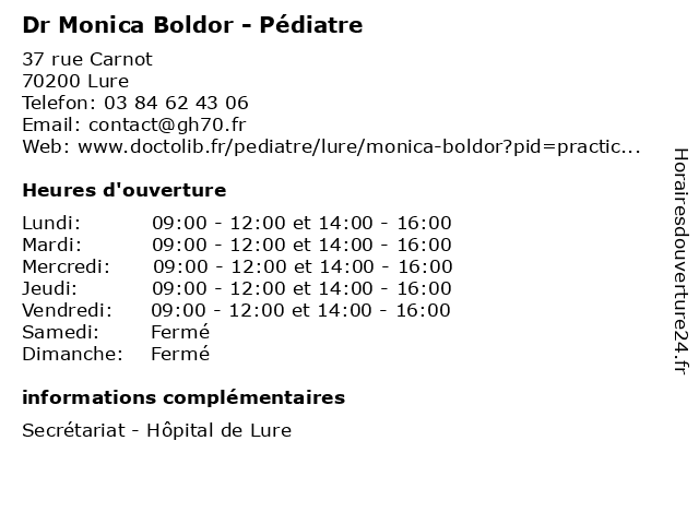 1 Dr Monica Boldor - Pédiatre (Distance: 18,05 km) 12 rue Grammont, 70300 Luxeuil-les-Bains boldor, consultation, docteur, dr, med, monica, médecin, médecine, pédiatre, traitement 2 Dr Catherine Ecrement - Pédiatre (Distance: 0,59 km) 10 bis Esplanade du General de Gaulle, 70200 Lure catherine, dr, ecrement, enfant, pediatre, pédiatre, sante, soins 3 Dr Monica Boldor - Pédiatre (Distance: 27,53 km) 2 Rue René Heymes, 70000 Vesoul boldor, consultation, docteur, dr, med, monica, médecin, pédiatre, traitement 4 Dr Alina Hritcu - Pédiatre - secrétariat (Distance: 27,44 km) 7 Place de la République, 90000 Belfort alina, dr, hritcu, médecins, médicaments, pédiatre, santé, secrétariat, spécialiste 5 Centre de protection maternelle et infantile (PMI) (Distance: 27,80 km) - Rue Basse, 70230 Dampierre sur Linotte centre, conseils, de, et, infantile, maternelle, parents, pmi, protection, prévention, puéricultrice, pédiatre 6 Dr Mohamed Mabrouk Bengrina - Pédiatre (Distance: 37,60 km) 1 rue Georges Lang, 88204 Remiremont bebe, bengrina, dr, m., mabrouk, mohamed, nourisson, pédiatre, pédiatrie |