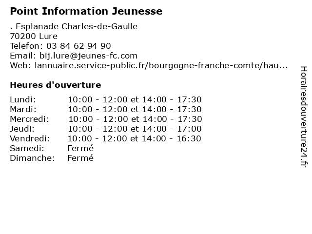 1 Point Information Jeunesse (Distance: 14,16 km) . Place du Général de Gaulle, 70290 Champagney administration, assoc, information, jeunesse, point, services, services publics 2 Centre d'Information et d'Orientation (CIO) (Distance: 0,07 km) 26 Bis Rue Pasteur, 70200 Lure administration, assoc, centre, cio, d'information, d'orientation, d’information, d’orientation, et, services, services publics 3 Point d'accès au Droit-Avocats- Horaires permanence d'information généraliste (Distance: 0,54 km) . Place de la Gare, 70200 Lure au, avocats, d'accès, d'information, droit, généraliste, horaires, permanence, point, public, services 4 Point d'information local dédié aux personnes âgées (Distance: 16,59 km) n/a Place du 8 Mai 1945, 70300 Luxeuil-les-Bains administration, assoc, associations, aux, d'information, des, dédié, greffe, local, locale, mission, personnes, point, services, services publics, âgées 5 Bureau Information Jeunesse (Distance: 17,02 km) 41 rue Victor-Genoux, 70300 Luxeuil-les-Bains administration, assoc, bureau, information, jeunesse, point, services, services publics 6 Point Information Jeunesse (Distance: 26,16 km) 35 Rue du Stade, 90200 Vescemont administration, assoc, information, jeunesse, point, services, services publics  |