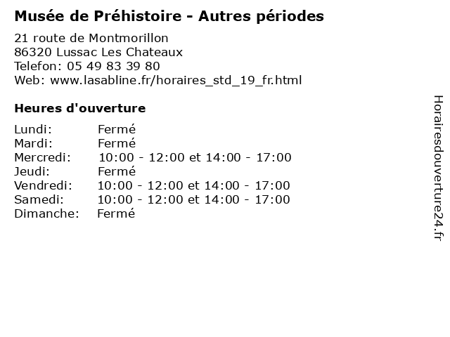 1 Musée de Préhistoire - De juin à septembre (Distance: 0,00 km) 21 route de Montmorillon, 86320 Lussac Les Chateaux de, exposition, juin, musée, préhistoire, septembre, visite 2 Musée de Préhistoire - Petites vacances scolaires (zone A) (Distance: 0,00 km) 21 route de Montmorillon, 86320 Lussac Les Chateaux de, exposition, musée, petites, préhistoire, scolaires, vacances, visite, zone 3 Abyssea - bowling (Périodes scolaires) (Distance: 6,91 km) - Route du Fond d'Orveau, 86320 Civaux abyssea, aqua, aquatique, bowling, périodes, scolaires 4 Piscine de Chauvigny - périodes scolaires (Distance: 19,59 km) - rue de la Maladrerie, 86300 Chauvigny aqua, aquatique, chauvigny, de, piscine, périodes, scolaires 5 Chateau de Forges - Juin/Juillet/Août/Septembre (Distance: 29,77 km) - D53, 36300 Concremiers ancien, art, chateau, de, et, exposition, forges, histoire, juin/juillet/août/septembre, livre, monument, musee, musée, office, savoir, tourisme, zoo 6 Chateau de Forges - Octobre à Avril (Distance: 29,77 km) - D53, 36300 Concremiers ancien, art, avril, chateau, de, et, exposition, forges, histoire, livre, monument, musee, musée, octobre, office, savoir, tourisme, zoo |