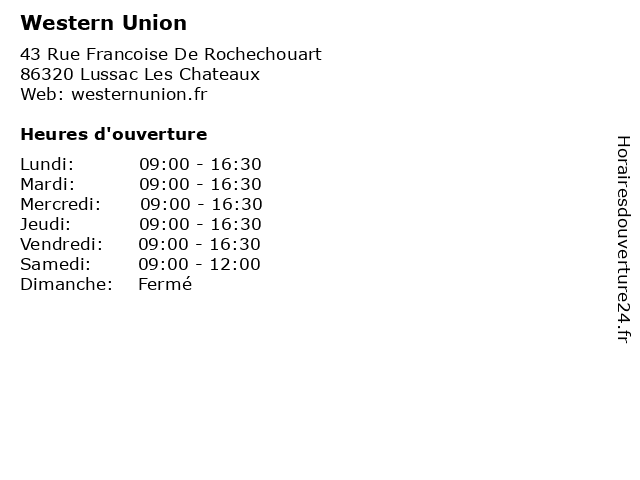 1 Western Union (Distance: 0,01 km) 2 Rue Francoise De Rochechouart, 86320 Lussac Les Chateaux centre de remmittance, l'argent, transfert d'argent, union, western 2 Western Union (Distance: 6,72 km) 46 Grand Rue, 86320 Persac centre de remmittance, l'argent, transfert d'argent, union, western 3 Western Union (Distance: 11,31 km) 29 Boulevard De Strasbourg, 86500 Montmorillon centre de remmittance, l'argent, transfert d'argent, union, western 4 Western Union (Distance: 18,98 km) 1 Avenue De Lussac, 86150 L Isle Jourdain centre de remmittance, l'argent, transfert d'argent, union, western 5 Western Union (Distance: 33,55 km) n/a De Beaulieu, 86000 Poitiers centre de remmittance, l'argent, transfert d'argent, union, western 6 Western Union (Distance: 35,50 km) 3 B Rue De L Universite, 86000 Poitiers centre de remmittance, l'argent, transfert d'argent, union, western |