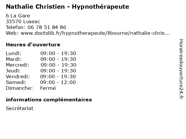 Termes de recherche pour Nathalie Christien - Hypnothérapeute:santé, nathalie, hypnose, hypnothérapeute, christien, hypno |