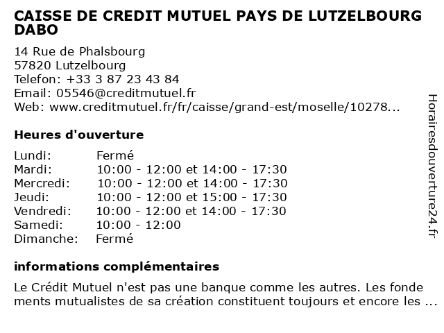 Termes de recherche pour CAISSE DE CREDIT MUTUEL PAYS DE LUTZELBOURG DABO:de, crédit, mutuel, caisse, pays, dabo, lutzelbourg |