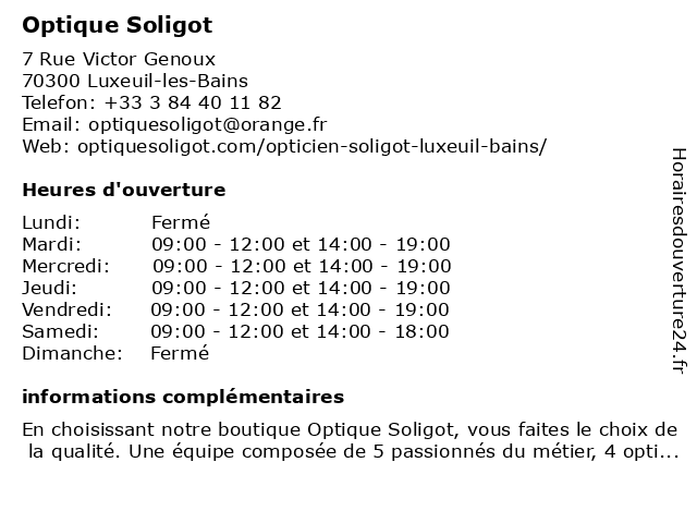 2 Centre Auditif Soligot (Distance: 0,12 km) 22 Rue Victor Genoux, 70300 Luxeuil-les-Bains auditif, centre, soligot 3 Écouter Voir Optique LUXEUIL LES BAINS (Distance: 0,49 km) 33 Rue Edouard Herriot, 70300 Luxeuil-les-Bains bains, les, luxeuil, optique, voir, écouter 4 Optique Valentini (Distance: 8,11 km) 6 Grande Rue, 70220 Fougerolles-Saint-Valbert optique, valentini 5 E.Leclerc Optique (Distance: 17,93 km) Centre commercial des cloyes, 70200 Lure e.leclerc, magasin de lunettes de soleil, opticien, optique, optométrie 6 Opticien LURE Générale d'Optique (Distance: 17,98 km) Rue des Platanes, 70200 Lure d'optique, examen de la vue, générale, lentilles de contact, lentilles progressives, lunette ray ban, lunettes, lunettes anti-lumière bleue, lunettes de conduite de nuit, lunettes de conduites de nuit, lunettes de soleil, lunettes de soleil pour enfant, lunettes de soleil pour femme, lunettes de soleil pour homme, lunettes de vue, lunettes de vue femme, lunettes de vue homme, lunettes progressives, lure, opticien, opticien proche de chez moi, optique, sport à la vue, vérification de la vue |