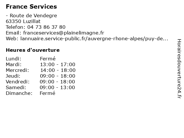 1 France Services (Distance: 5,85 km) 12 Place De La Mairie, 63310 Randan administration, communes, france, service, services, services publics 2 France Services (Distance: 17,85 km) 2 Rue Francois Mitterrand, 63300 Thiers administration, communes, france, service, services, services publics 3 France Hygiène Ventilation (Distance: 2,99 km) - Rue du Patural, 63310 Saint Denis Combarnazat entretien, france, hygiène, ventilation 4 Mairie de Vinzelles (Distance: 4,31 km) n/a Le Bourg, 63350 Vinzelles administration, assoc, associations, aux, bussières, d'information, de, des, dédié, greffe, information, local, locale, mairie, mission, personnes, point, services, services publics, vinzelles 5 Mairie de Bulhon (Distance: 4,31 km) . Le Bourg, 63350 Bulhon administration, bulhon, de, mairie, publics, services 6 Mairie de Randan (Distance: 5,85 km) 11 place de la Mairie, 63310 Randan administration, assoc, associations, aux, bussières, d'information, de, des, dédié, greffe, information, local, locale, mairie, mission, personnes, point, randan, services, services publics |
