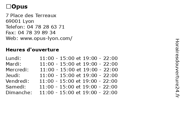 | Dimanche | 11:00-15:00 et 19:00-22:00 |