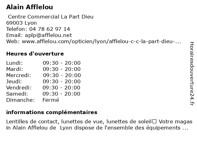 1 Alain Afflelou (Distance: 0,04 km) 17 rue du Docteur Bouchut, 69431 Lyon afflelou, alain, lentilles, lunettes, opticien, optique 2 Alain Afflelou (Distance: 2,44 km) - Lyon Part Dieu Mall, 69003 Lyon afflelou, alain, glasses, optician, store 3 Alain Afflelou (Distance: 5,23 km) Centre Commercial Carrefour, 69200 Vénissieux afflelou, alain, cabinet d'ophtalmologie, magasin de lunettes de soleil, ophtalmologie, optométrie 4 Alain Afflelou (Distance: 6,00 km) 236 Avenue Franklin Roosevelt, 69120 Vaulx-en-Velin afflelou, alain, lunettes, montures, opticien, optique 5 Alain Afflelou (Distance: 6,02 km) Centre Commercial Carrefour 7 Chemins, 69120 Vaulx-En-Velin afflelou, alain, cabinet d'ophtalmologie, magasin de lunettes de soleil, ophtalmologie, optométrie 6 Alain Afflelou (Distance: 6,22 km) 74 Grande Rue, 69600 Oullins accessoires, afflelou, alain, lentilles de contact, lunettes, opticien, optique |