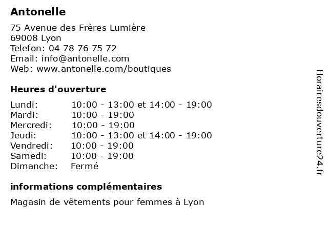 1 Antonelle (Distance: 2,65 km) 40 Avenue Henri Barbusse, 69100 Villeurbanne accessoires, antonelle, femmes, jeans, mode, vêtements 2 Antonelle (Distance: 3,15 km) 73 Rue du Président Édouard Herriot, 69002 Lyon accessoires, antonelle, boutique, mode, prêt a porter, vêtements 3 Antonelle (Distance: 4,58 km) 33 Grande Rue de la Croix-Rousse, 69004 Lyon accessoires, antonelle, boutique, mode, prêt a porter, vêtements 4 Antonelle (Distance: 29,71 km) 455 Rue Nationale, 69400 Villefranche-sur-Saône antonelle, femme, magasin, prêt à porter, vêtements 5 Culinarion (Distance: 0,02 km) 77 Avenue des Frères Lumière, 69008 Lyon boutique, cuisine, culinarion, magasin, matériel, ustensile 6 Benetton (Distance: 0,02 km) 77 Avenue des Frères Lumière, 69008 Lyon accessoires, benetton, boutique, enfant, femme, habillement, homme, mode |