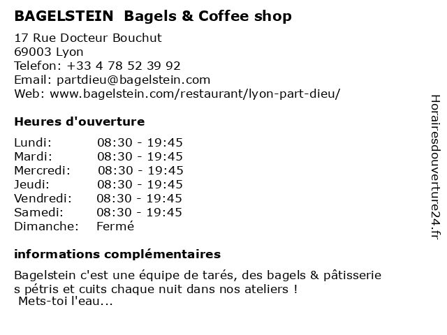 1 BAGELSTEIN Bagels & Coffee shop (Distance: 1,71 km) 6 Rue du Président Édouard Herriot, 69001 Lyon bagels, bagelstein, café, cakes, coffee, cookies, fast food, pastries, pâtisseries, sandwichs, shop, soupes 2 BAGELSTEIN Bagels & Coffee shop (Distance: 2,05 km) 14 Rue Victor Hugo, 69002 Lyon bagels, bagelstein, blague, café, cakes, coffee, cookies, fast food, pastries, pâtisseries, sandwichs, shop, soupes 3 Etienne Coffee-Shop (Distance: 0,03 km) 17 rue Docteur Bouchut, 69003 Lyon boisson, café, coffee, etienne, restauration, shop, thés, torréfacteur 4 Starbucks Coffee (Distance: 0,03 km) 17 rue du Docteur Bouchut, 69003 Lyon café, coffee, coffee shop, petit-déjeuner, rapide, restauration, starbucks, thé 6 Hello Brooklyn - Donuts et Coffee Shop (Distance: 1,53 km) 17 Rue Childebert, 69002 Lyon bar, breakfast, brooklyn, coffee, donuts, et, hello, shop |
