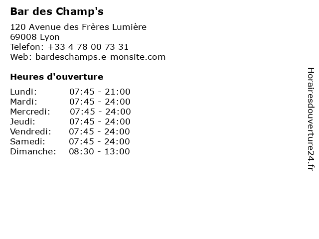 1 Bar des Champ's (Distance: 0,00 km) 120 Avenue Des Freres Lumiere, 69008 Lyon bar, bistro, bistrot, brasserie, café, champ's, des, pub, restaurant, restauration, resto 2 Bar des Champ's (Distance: 0,02 km) 120 Avenue des Frères Lumière, 69008 Lyon bar, bars, business, champ's, des, liquors 4 L'Entracte Bar Restaurant (Distance: 2,65 km) 123 Rue André Bollier, 69007 Lyon bar, bars, business, l'entracte, liquors, restaurant 6 Les Fleurs du Malt le Bar (Distance: 3,81 km) 15 Quai Romain Rolland, 69005 Lyon bar, bars, business, du, fleurs, le, les, liquors, malt |