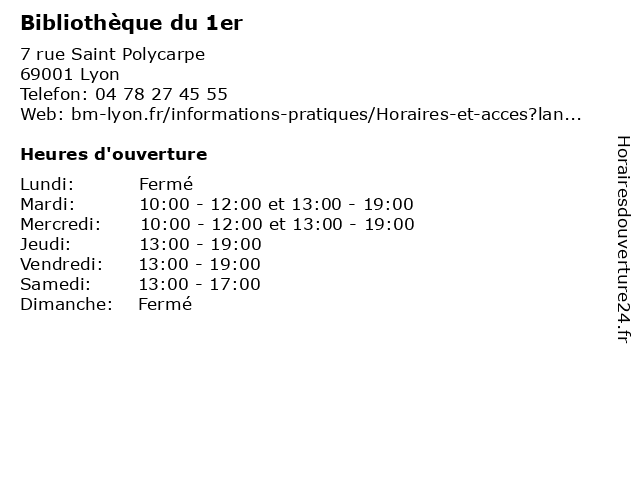 1 Bibliothèque du 1er (Espace jeunesse) (Distance: 0,00 km) 7 rue Saint Polycarpe, 69001 Lyon 1er, bibliotheque, bibliothèque, du, emprunter, espace, jeunesse, lire, livres, savoir 2 Bibliothèque du 1er (Espace numérique adulte) (Distance: 0,00 km) 7 rue Saint Polycarpe, 69001 Lyon 1er, adulte, bibliotheque, bibliothèque, du, emprunter, espace, lire, livres, numérique, savoir 3 CathAm Soie (Du 1er avril au 31 décembre) (Distance: 0,93 km) 24 rue du Bœuf, 69005 Lyon 1er, 31, accessoires, au, avril, catham, du, décembre, mode, soie 4 City Aventure (1er juillet au 31 août) (Distance: 5,64 km) 8 Chemin de la Croix Berthet, 69110 Sainte-Foy-lès-Lyon 1er, 31, août, au, aventure, city, juillet, loisirs, parc 5 Boulodrome Municipal (du 1er octobre au 30 avril) (Distance: 6,02 km) 1 Rue Louis Normand, 69600 Oullins 1er, 30, au, avril, boulodrome, du, municipal, octobre 6 Parc de Parilly (du 1er mai au 30 septembre) (Distance: 6,21 km) - Boulevard Émile Bollaert, 69500 Bron 1er, 30, au, de, du, jardin, mai, parc, parilly, septembre, square |
