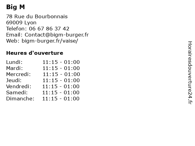 1 Big M (Distance: 8,36 km) 15 rue Charles Plasse, 69190 Saint-Fons big, boissons, burger, fastfood, frites, restaurant 2 Big M (Distance: 8,54 km) 3 avenue de la Rize, 69100 Villeurbanne big, boissons, burger, fastfood, frites, restaurant 3 Big M (Distance: 13,89 km) 57 Route de Jonage, 69150 Décines-Charpieu big, boissons, burger, fastfood, frites, menus, restaurant 5 Big Fernand (Distance: 0,69 km) 28 Rue Sergent Michel Berthet, 69009 Lyon big, boisson, fernand, repas, restaurant 6 |