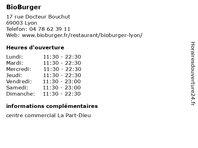 1 Bioburger Lyon Part-Dieu (Distance: 0,11 km) 17 Rue Dr Bouchut Centre Commercial De Lyon Part-dieu Niveau 3 "les Tables", 69003 Lyon bioburger, dieu, fast-food, lyon, part, restaurant américain, restaurant de hamburgers, restaurant végétarien 2 Bioburger Lyon Opéra (Distance: 1,56 km) 18 Rue Du Bât D'argent, 69001 Lyon bioburger, fast-food, lyon, opéra, restaurant américain, restaurant végétarien, restaurants 3 Bistro Régent (Distance: 0,00 km) 17 rue Docteur Bouchut, 69003 Lyon bio, bistro, boisson, burger, fastfood, frites, restaurant, régent 4 O'Tacos (Distance: 0,00 km) 17 rue Docteur Bouchut, 69003 Lyon boissons, fastfood, frites, o'tacos, restaurant, tacos 5 Chicken Time (Distance: 0,20 km) 11 Boulevard Marius Vivier Merle, 69003 Lyon burger, chicken, fastfood, frites, poulet, time 6 Miwam (Distance: 0,21 km) 30 bd Vivier-Merle, 69003 Lyon alimentaire, bistrot, fastfood, miwam, restaurant |