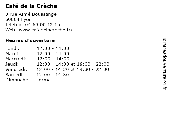 | Vendredi | 12:00-14:30 et 19:30-22:00 |