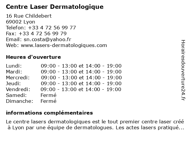 1 My Laser Lyon - Epilation laser & Médecine esthétique (Distance: 0,16 km) 54 Rue De La République, 69002 Lyon centre de remise en forme, dermatologie, dermatologie esthétique, epilation, esthétique, laser, lyon, my, médecine, service d'épilation, service de détatouage 2 Alliance Laser Anti-Tabac (Distance: 0,89 km) 12 rue Molière, 69006 Lyon alliance, anti, arrêter, fumer, laser, laser anti, tabac 3 Laser - Coiffure & Esthétique (Distance: 2,36 km) 29 Avenue Georges Pompidou, 69003 Lyon barbe, barber, coiffure, esthétique, laser, rasage, épilation 4 Deka Technologies Laser (Distance: 2,36 km) 4 Rue Paul Massimi, 69007 Lyon deka, fabricant, laser, matériel, médical, technologies 5 Laser Force (Distance: 3,25 km) 76 avenue Debourg, 69007 Lyon découpe, force, industrielle, jet d'eau, laser, sous-traitance 6 SEI Laser France (Distance: 4,21 km) 17 rue du Professeur Jean Bernard, 69007 Lyon fabrication, france, laser, sei, systèmes, technologie |
