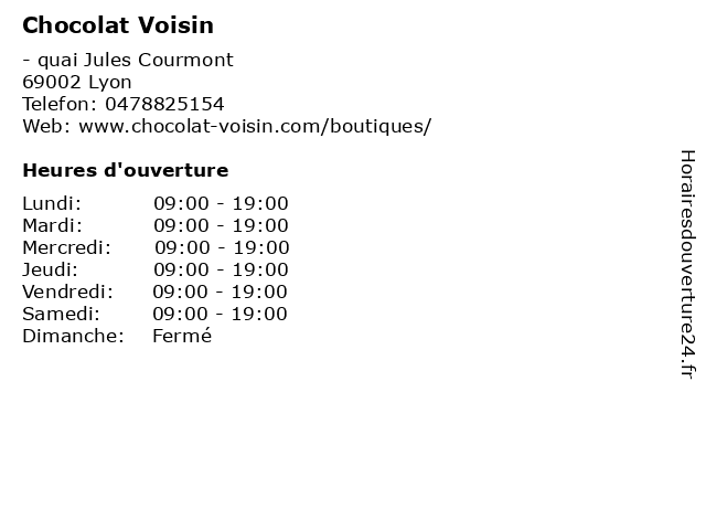 1 Chocolat Voisin (Distance: 0,56 km) 24 place des Terreaux, 69001 Lyon cafes, chocolat, chocolats, dragees, macarons, thes, voisin 2 Chocolat Voisin (Distance: 0,97 km) 102 cours Lafayette, 69003 Lyon cafes, chocolat, chocolats, dragees, macarons, thes, voisin 3 Chocolat Voisin (Distance: 1,20 km) 3e niveau, 69003 Lyon cafes, chocolat, chocolats, dragees, macarons, thes, voisin 4 Chocolat Voisin (Distance: 1,23 km) 10 cours Vitton, 69006 Lyon cafes, chocolat, chocolats, dragees, macarons, thes, voisin 5 Chocolat Voisin (Distance: 1,28 km) 17 rue du Docteur Bouchut, 69003 Lyon chocolat, confiserie, nougat, tablettes, voisin 6 Chocolat Voisin (Distance: 1,55 km) 2 Grande Rue de la Croix Rousse, 69004 Lyon cafes, chocolat, chocolats, dragees, macarons, thes, voisin |
