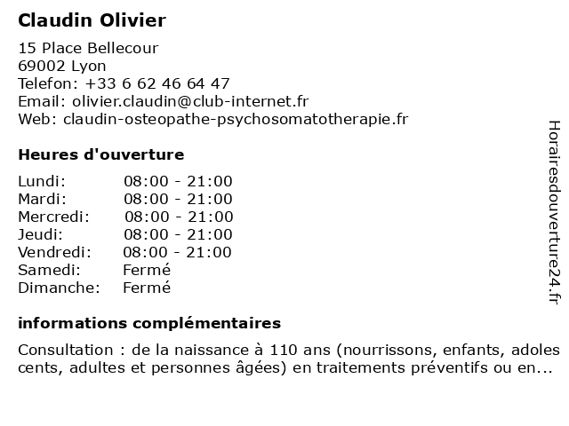 2 Cabinet psychologue Olivier Plancade (Distance: 0,00 km) 15 Place Bellecour, 69002 Lyon cabinet, olivier, plancade, psychanalyste, psychologue, psychothérapeute, thérapie 3 Dr Henri-Olivier Marion-Audibert - Rhumatologue (Distance: 0,18 km) 8 Place Bellecour, 69002 Lyon audibert, consultation, docteur, dr, henri, marion, olivier, rhumatologie, rhumatologue, santé, secrétariat 4 Olivier Desforges (Distance: 0,35 km) 42 Rue de la République, 69002 Lyon accessoires, boutique, desforges, linges, magasin, maison, olivier 5 Olivier Piet-Bordier - Psychologue (Distance: 0,35 km) 29 Place Bellecour, 69002 Lyon bordier, boutons, dermatologue, docteur, liason, olivier, piet, psychologue, venerologue 6 Dr. Olivier Doat- Ophtalmologie (Distance: 0,37 km) 62 Rue de Brest, 69002 Lyon consultation, doat, docteur, dr., olivier, ophtalmologie, santé |