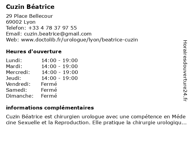 1 Maître Béatrice Abel - Avocate (Distance: 0,97 km) 56 rue Servient, 69003 Lyon abel, avocate, avocats, béatrice, civils, droits, juridiques, maître 2 Dr Béatrice Kugener - Pédiatre (Distance: 1,02 km) 32 Rue Raulin, 69007 Lyon béatrice, consultation, docteur, dr, kugener, med, médecin, médecine, pédiatre, secrétariat, traitement 3 Dr Béatrice Menard - Médecin généraliste (Distance: 1,09 km) 10 Rue De Sevigne, 69003 Lyon béatrice, dr, généraliste, menard, médecin, médecine, médical, pharmaceutique, secretariat, traitement 5 Ginier-Gillet Béatrice (Distance: 1,34 km) 151 Avenue Maréchal de Saxe, 69003 Lyon béatrice, gillet, ginier 6 Maître Béatrice Canton-Debat - Avocat (Distance: 1,40 km) 160 Rue Vendôme, 69003 Lyon avocat, béatrice, canton, debat, justice, lois, maitre, maître |