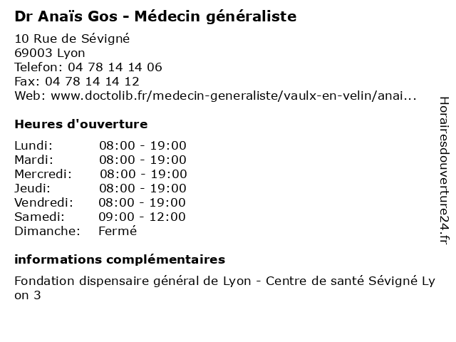 1 Dr Anaïs Gos - Médecin généraliste (Distance: 6,36 km) 40 Avenue Georges Rouge, 69120 Vaulx-en-Velin anaïs, docteur, dr, generaliste, gos, généraliste, medical, médecin, soin 2 Dr Anaïs Bezzazi Lefebvre - Médecin généraliste (Distance: 0,00 km) 10 Rue de Sévigné, 69003 Lyon anais, anaïs, bezzazi, dr, généraliste, généraux, lefebvre, médecin, soins 3 Anaïs Dinten - Psychologue (Distance: 0,99 km) 1 Rue Victor Hugo, 69002 Lyon anaïs, dinten, folie, psychiatre, psychiatrie, psychiatrique, psychologue 4 Anaïs Glabi - Ergothérapeute (Distance: 1,91 km) 7 Rue Antoine Barbier, 69006 Lyon anaïs, bilan, cognitif, ergothérapeute, fonctionnelle, glabi, rééducation 5 Anaïs Eynard - Masseur-kinésithérapeute (Distance: 2,56 km) 92 Boulevard Yves Farge, 69007 Lyon anaïs, eynard, kiné, kinésithérapeute, masseur, rééducation, soin 6 Anaïs Dupuy - Ostéopathe (Distance: 2,82 km) 14 Quai Joseph Gillet, 69004 Lyon anaïs, dupuy, kiné, kinésithérapeute, ostéopathe, rééducation, soin |