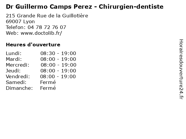1 Dr Guillermo Camps Perez - Chirurgien-dentiste (Distance: 1,07 km) 219 Grande Rue de la Guillotière, 69007 Lyon camps, chirurgien, consultation, dentiste, docteur, dr, guillermo, med, perez, secrétariat 2 Dr Daniel Reyes Perez - Chirurgien-dentiste (Distance: 0,02 km) 219 Grande Rue de la Guillotière, 69007 Lyon chirurgien, daniel, dent, dentiste, docteur, dr, perez, reyes, soins 3 Anthony Camps - Ostéopathe (Distance: 2,66 km) 7 Cours Docteur Jean Damidot, 69100 Villeurbanne anthony, camps, ostéo, ostéopathe, ostéopathes, soins 4 Dr Simon Perez - Chirurgien plasticien et esthétique (Distance: 2,94 km) 64 Avenue Rockefeller, 69008 Lyon chirurgien, docteur, dr, esthétique, et, perez, plasticien, sante, simon, soins 5 Anaël Perez - Ostéopathe (Distance: 3,71 km) 13 Quai de Pierre-Scize, 69009 Lyon anaël, ostéo, ostéopathe, ostéopathes, perez, soins 6 Raphael Perez - Naturopathe (Distance: 4,87 km) 24 Avenue Joannes Masset, 69009 Lyon medecin, naturopathe, perez, plante, raphael, sante |
