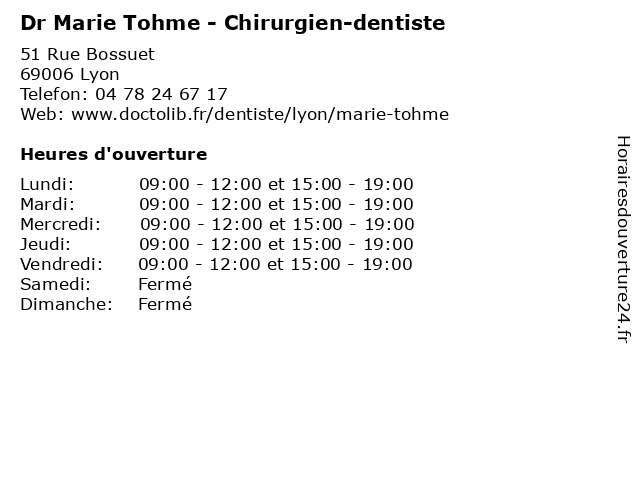 1 Marie-Hélène Lagier - Hypnothérapeute (Distance: 0,13 km) 8 Cours Vitton, 69006 Lyon helene, hypno, hypnose, hypnothérapeute, hélène, lagier, marie, sante 2 Maître Claire Marie - Avocate (Distance: 0,23 km) 72 Rue Tronchet, 69006 Lyon avocate, avocats, cabinet, claire, conseils, contentieux, juridique, justice, litiges, marie, maître, services 4 Dr Julien Marchand - Chirurgien-dentiste (Distance: 0,32 km) 74 Rue Vauban, 69006 Lyon chirurgien, dentiste, dr, julien, marchand, médecin, médecine, médical, pharmaceutique, traitement 5 Dr Nicole Perrelle - Chirurgien-dentiste (Distance: 0,32 km) 74 Rue Vauban, 69006 Lyon chirurgien, dentaire, dentiste, dr, implantologie, nicole, parodontologie, perrelle 6 Dr Olivier Hauchard - Chirurgien-dentiste (Distance: 0,32 km) 74 Rue Vauban, 69006 Lyon chirurgien, dentaire, dentiste, dr, hauchard, implantologie, olivier, parodontologie |